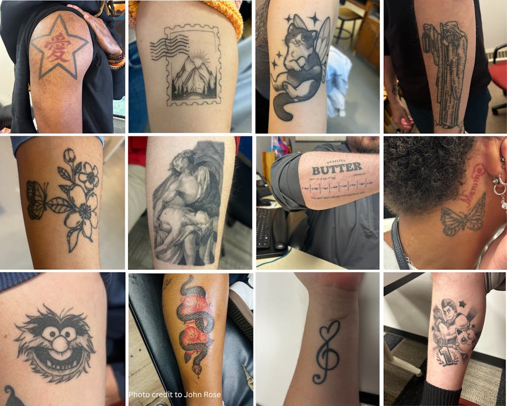 A collage of tattoos that people have around campus. Credit for the snake with flowers picture to John Rose.